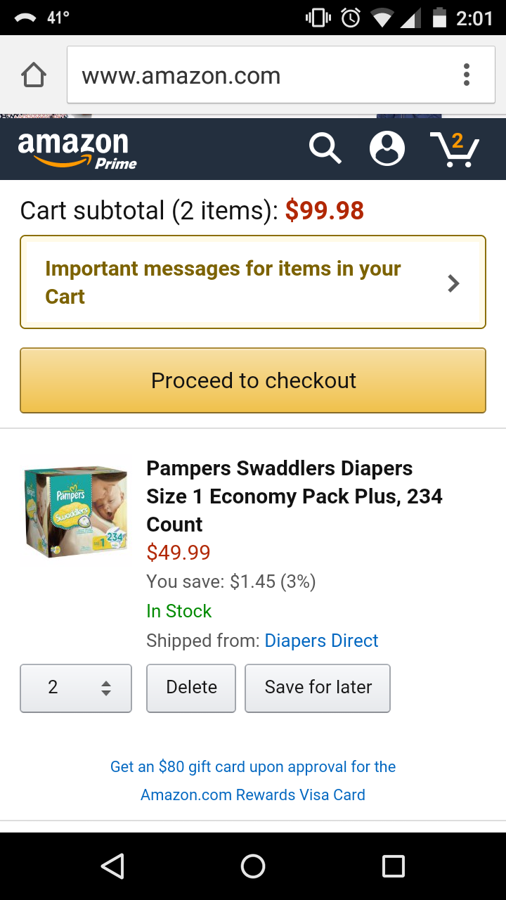 So, using those estimates for a new born and factoring in my son’s sensitive tushy skin, if he were to use disposable diapers, he would use Pampers Swaddlers size 1. Now their economy pack plus for size 1 is only 234 count, so that leaves me needing 102 diapers per month. So for the sake of simplicity, let’s say I just buy two economy plus boxes of diapers per month as cheaply as possible on Amazon.com.