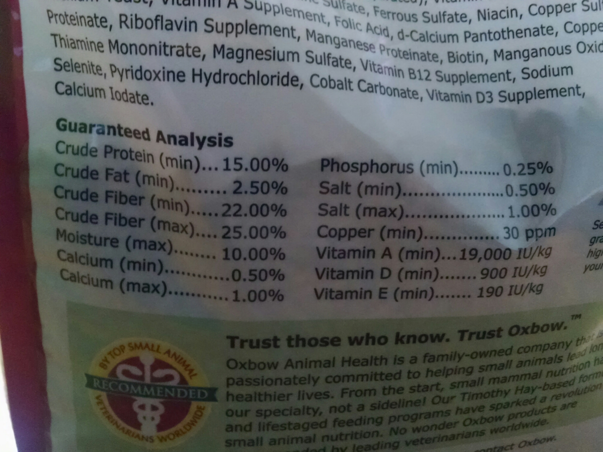 Suggested fat for a rabbit her size is 1% so this Oxbow feed is a bit higher, but realistically, it should be fine for her since she is under a year old (13 weeks)