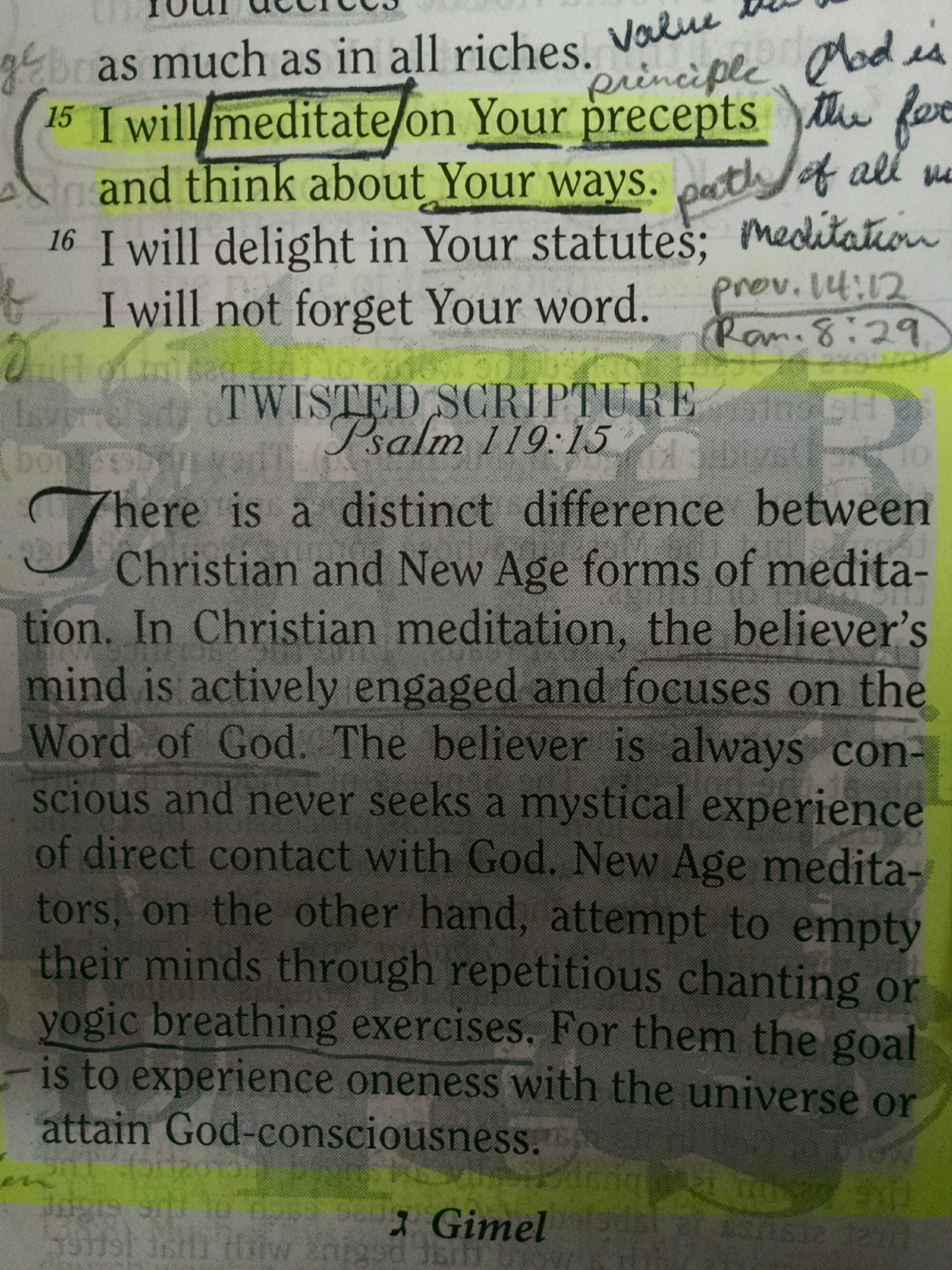 I do not meditate. (Psalm 119:15). Meditation for a Christian means the mind is actively engaged focusing on the word of God. This is different from dharana, or “one-pointed concentration” of yoga in that our attention as Christians is turned heavenward to God as opposed to inward toward the body or the breath. My goal is a closer walk with Jesus and not an experience of oneness with the universe or Samadhi, God-consciousness. Words mean things, and we have to be very careful in what we say so that it honors God. “I tell you that on the day of judgment people will have to account for every careless word they speak.” (Matthew 12:36) I want my words to always glorify God.
