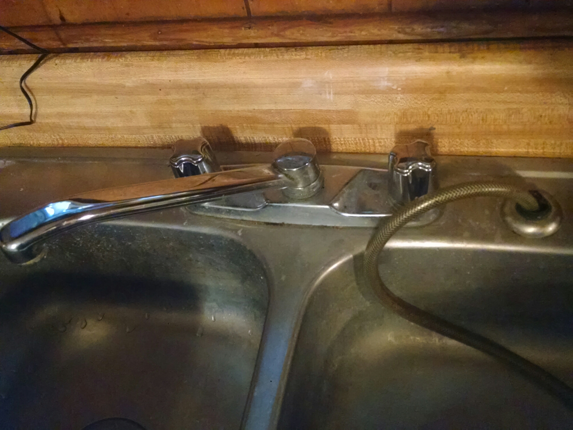3) there was some water damage to the back of the counter top where water had been accumulating and leaking under the sink basin- we cleaned it with bleach and let it dry out, then sealed around the new sink with plumbers putty. We plan on redoing all the kitchen cabinets and countertops once we can afford to tackle the $1800+ project, but until then, this should suffice to end the leak and pause or kill the rot/mold.
