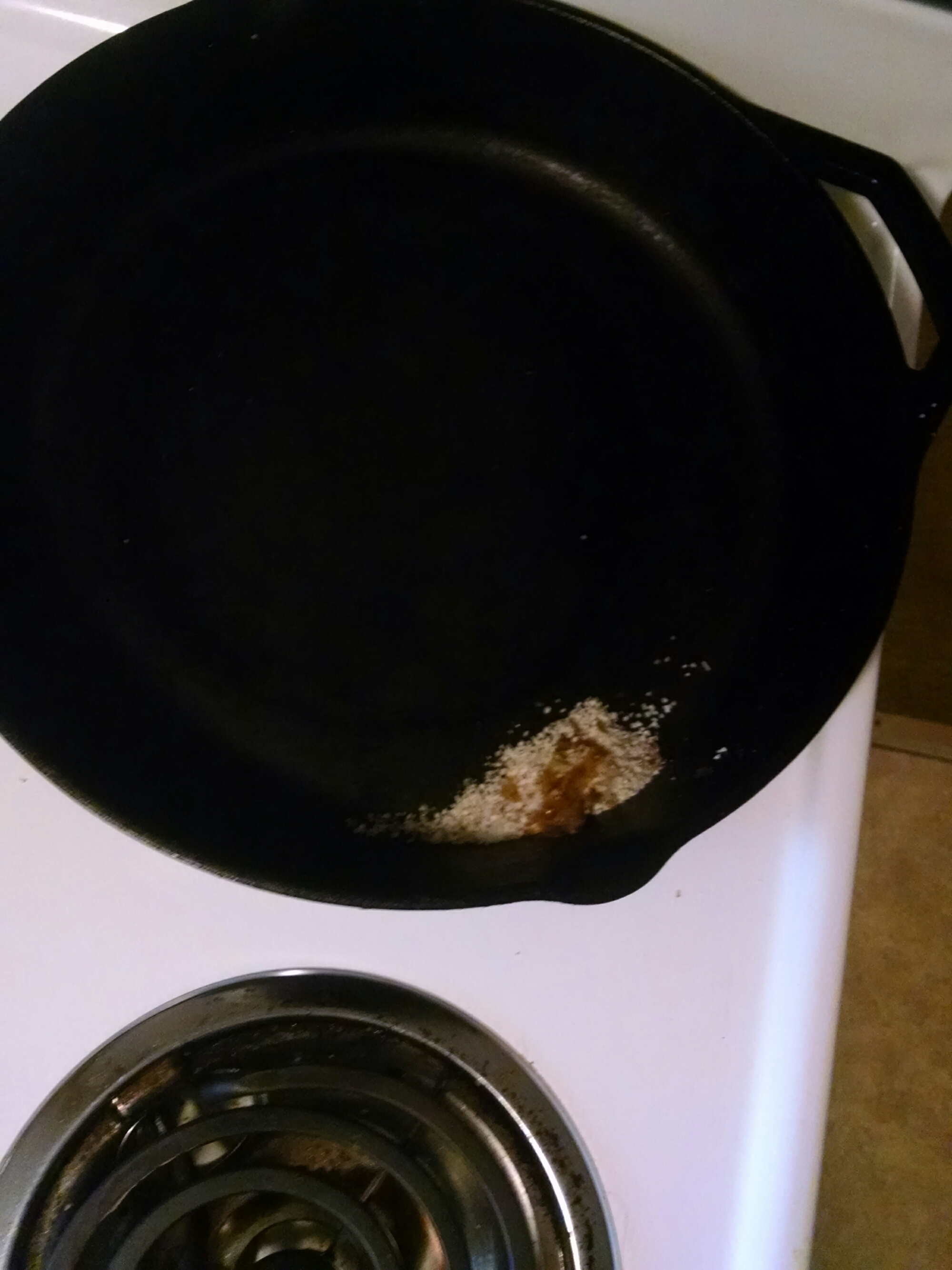 Dump the salt/residual food bits and viola! Your cast iron is clean and ready to go for its next use.