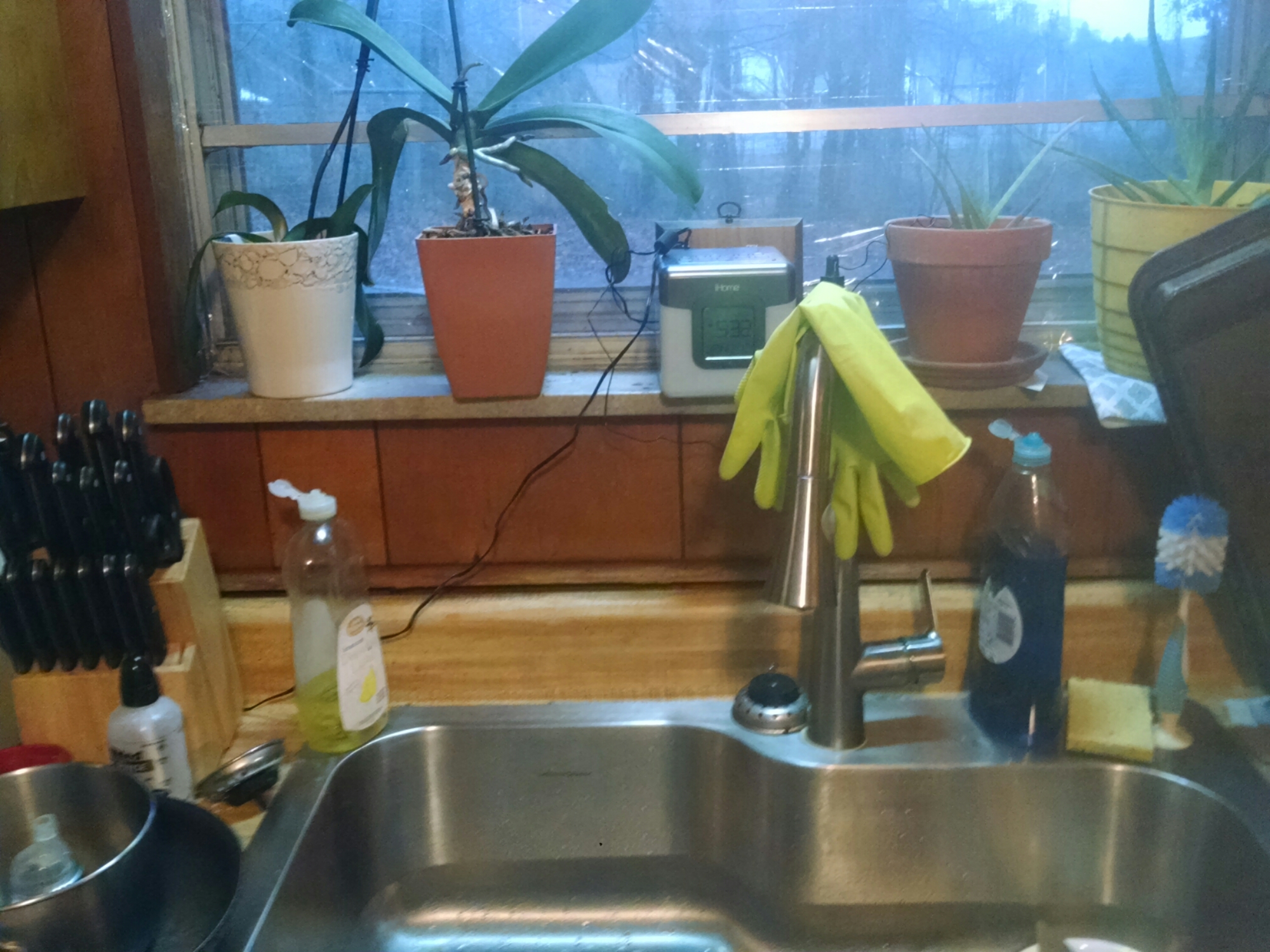 - Plant placement- because of their need for humidity and partial shade, I keep my orchids on the window sill above the kitchen sink. They get moist heat when I hand wash dishes and the amount of sunlight from the north facing window is just right.