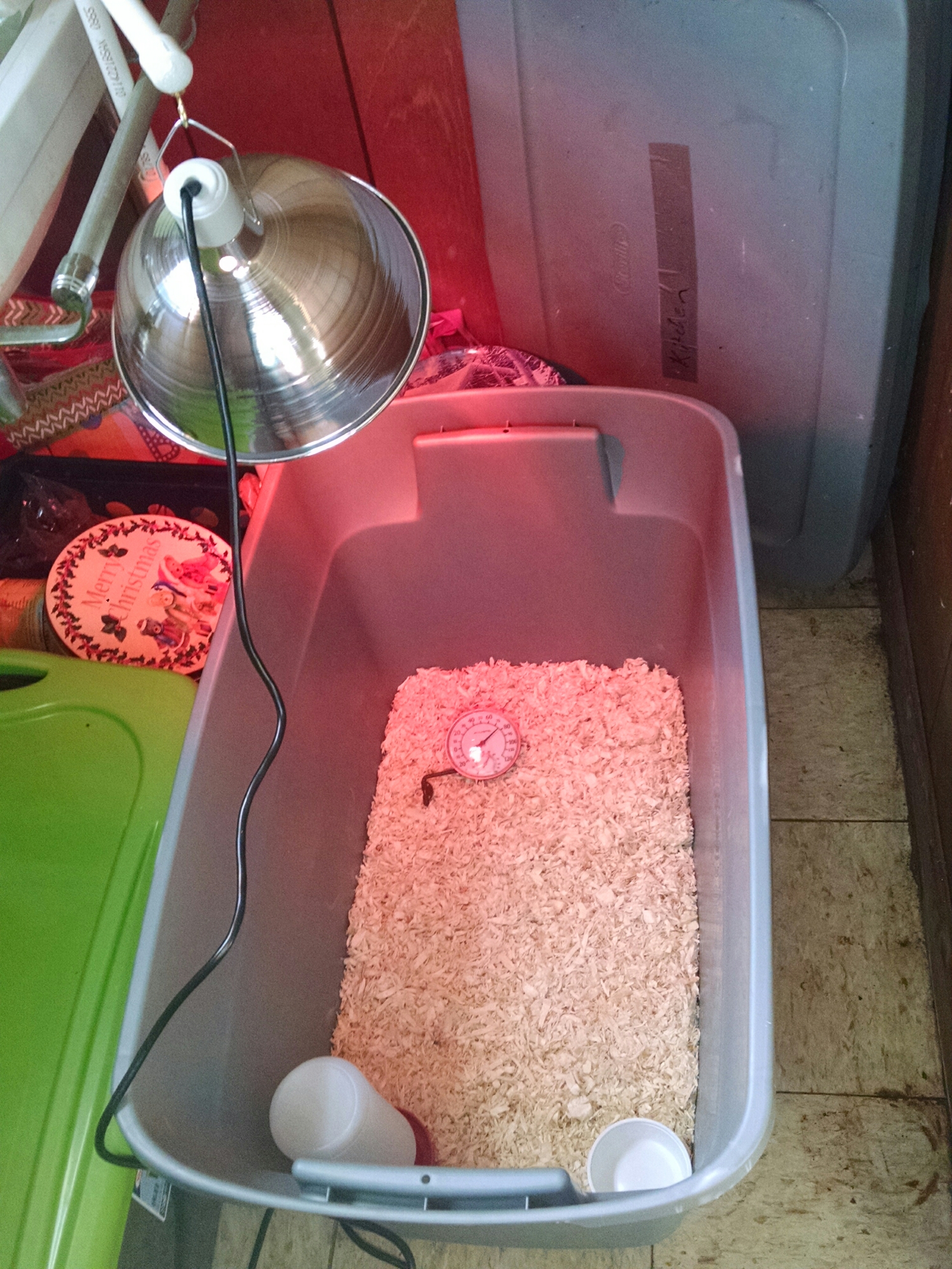 We’ll see once they get here. Finally got the temp to settle at about 95°F under the heat lamp, until about 3:00pm when the sun comes hot through the window, and it spiked to about 110°… We’ll have to figure out a better way to regulate the temperature.