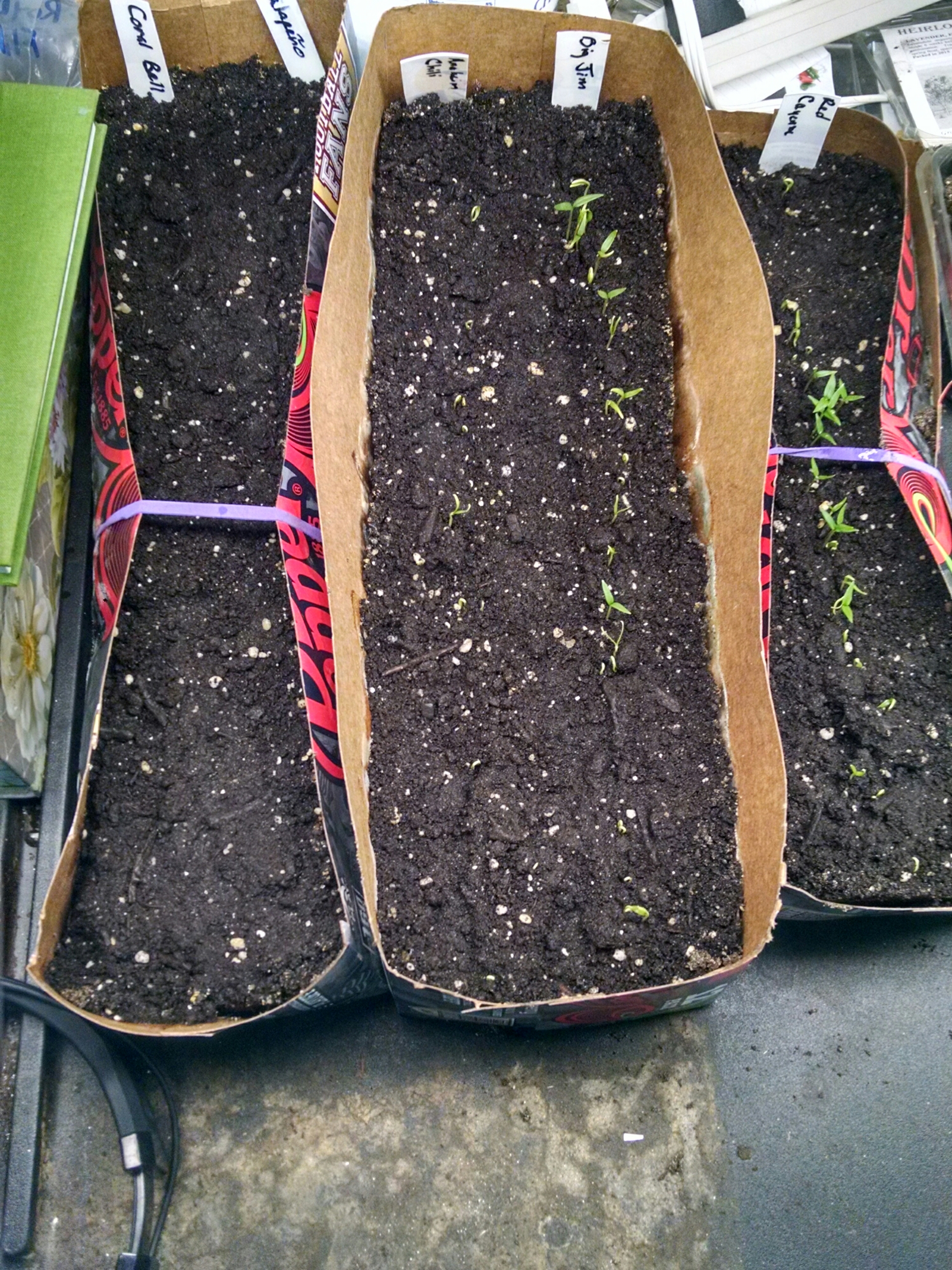 Still no bell or jalapeños, but I was pleased to see the cayenne seeds I saved last summer have all sprouted and are doing well.