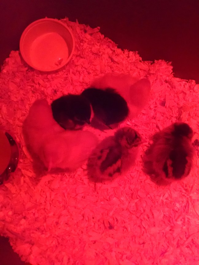 We’ve got 3 Buff Orpingtons (yellow chicks), 2 Ameraucanas (pretty brown patterned ones), and 2 Black Australorps (black ones). Our two Marans will be here tomorrow or Friday.
