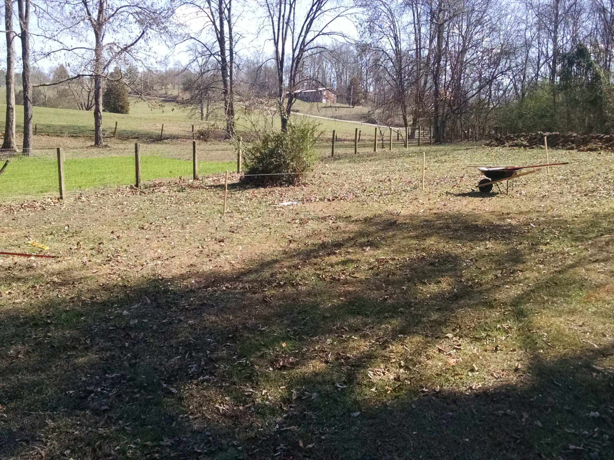 I started at the top of the hill and placed a stake. Then I stepped out 8′ and placed another. I did that every 8′ all the way to the base of the hill.