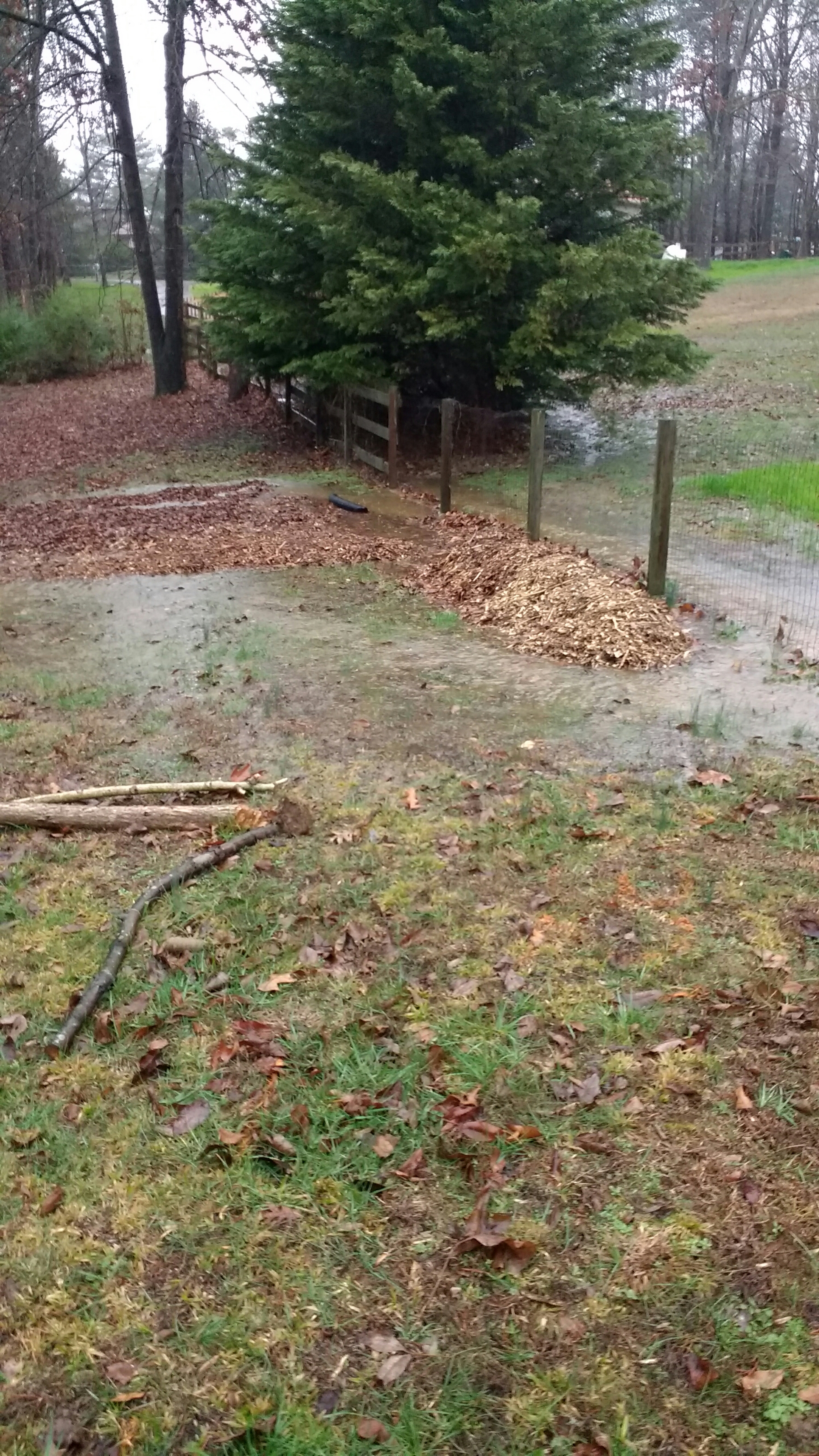 We got rain water coming across the fence line and pouring into our Back to Eden plot… It effectively washed away everything in a 2×6′ area. I was deeply disheartened.