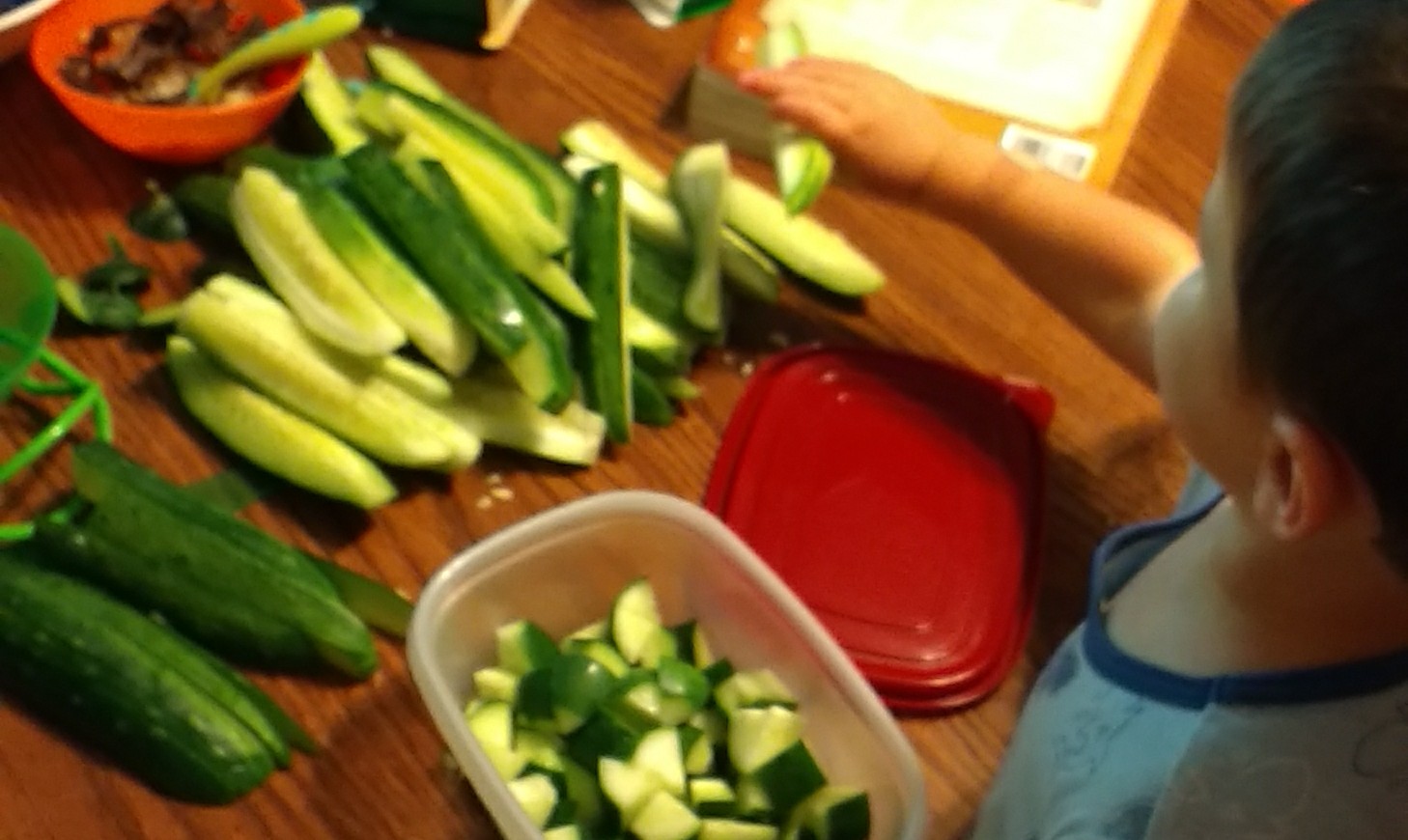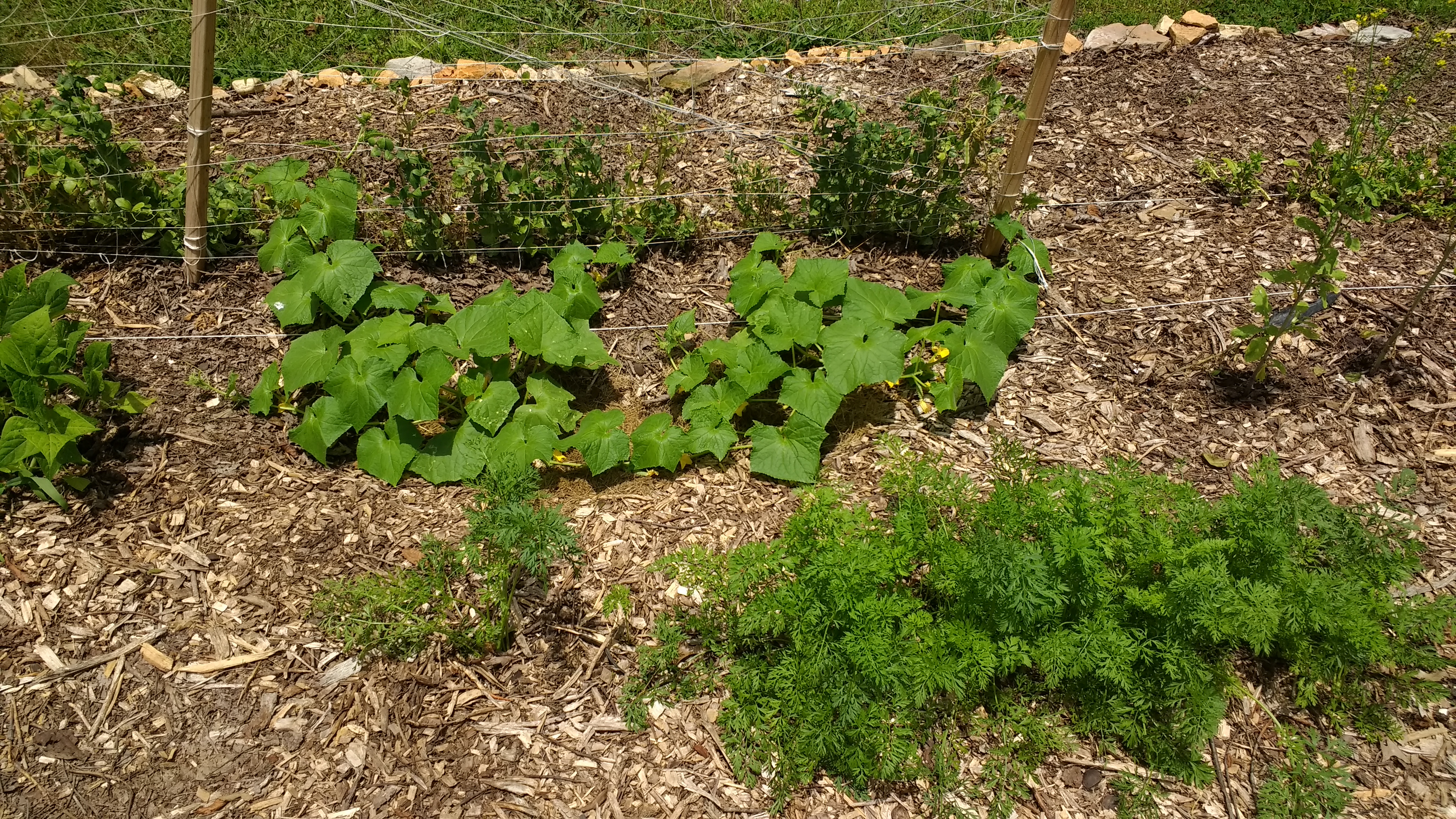 We’ve been getting about 3-4 cukes per week from our two space master bush type cucumber plants. I chose that variety partially on a whim and impulse buy from Walmart, and partially because I didn’t want to mess with trellising the vines.