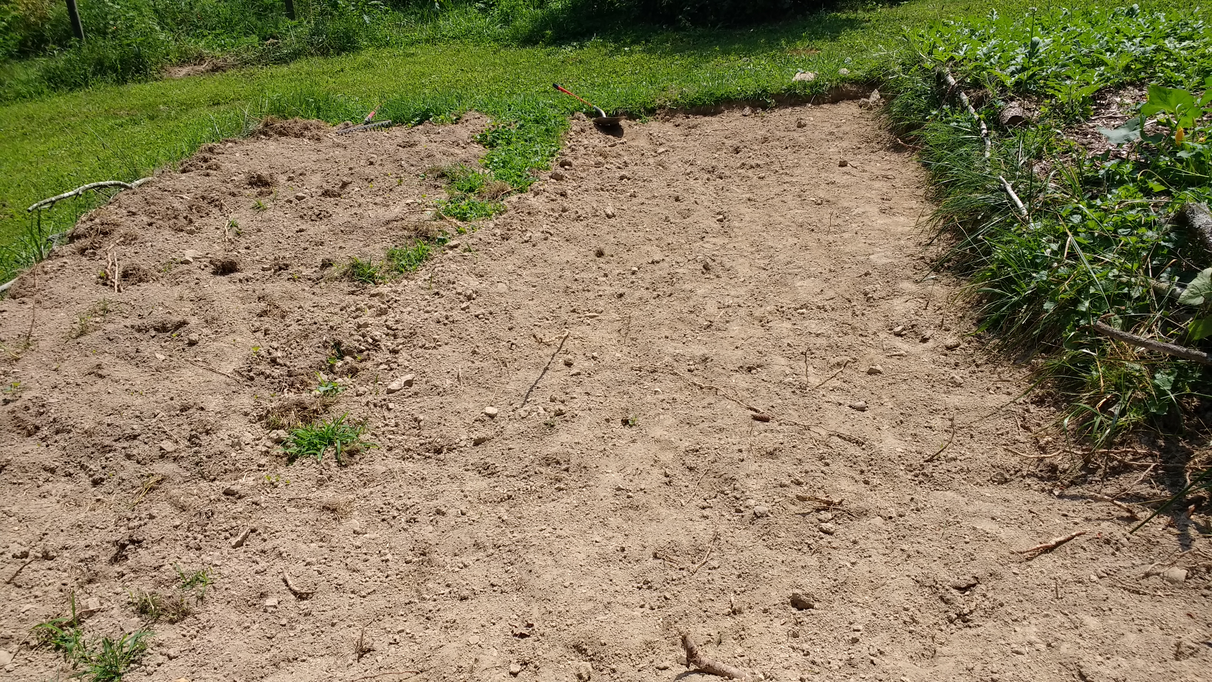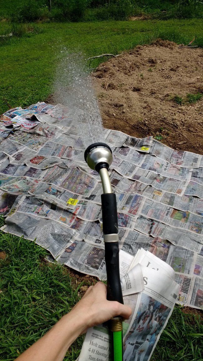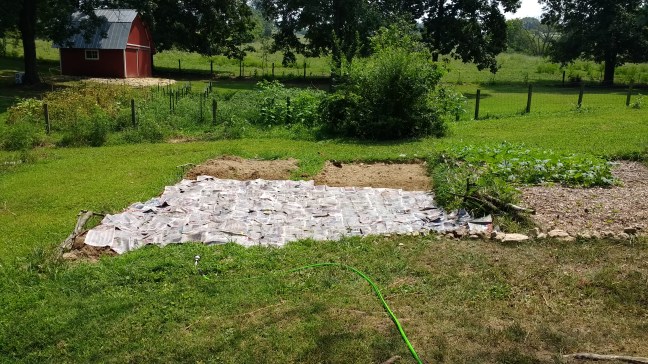 My husband and his dad dug out the 2nd level of the terrace. Right now you can see how rocky and dead the clay soil is. Not a single worm or cricket. I haven’t gotten a chance to finish applying the wood chip mulch yet, but all in good time. My big push for autumn preparations for the garden will begin in late September/early October. And I think I want that particular area for potatoes. Now if I could just keep my son from playing with the newspaper as I lay it down…