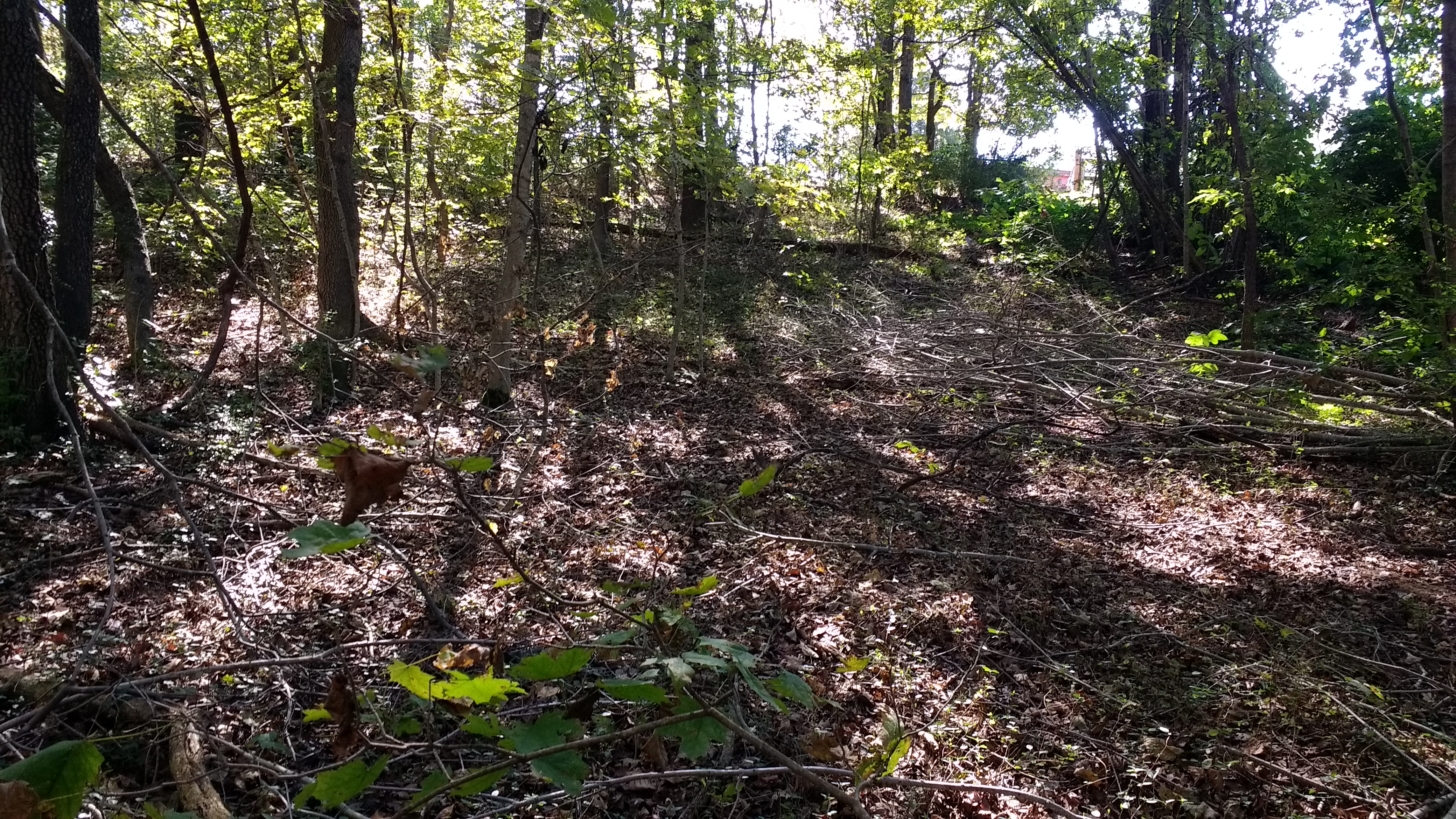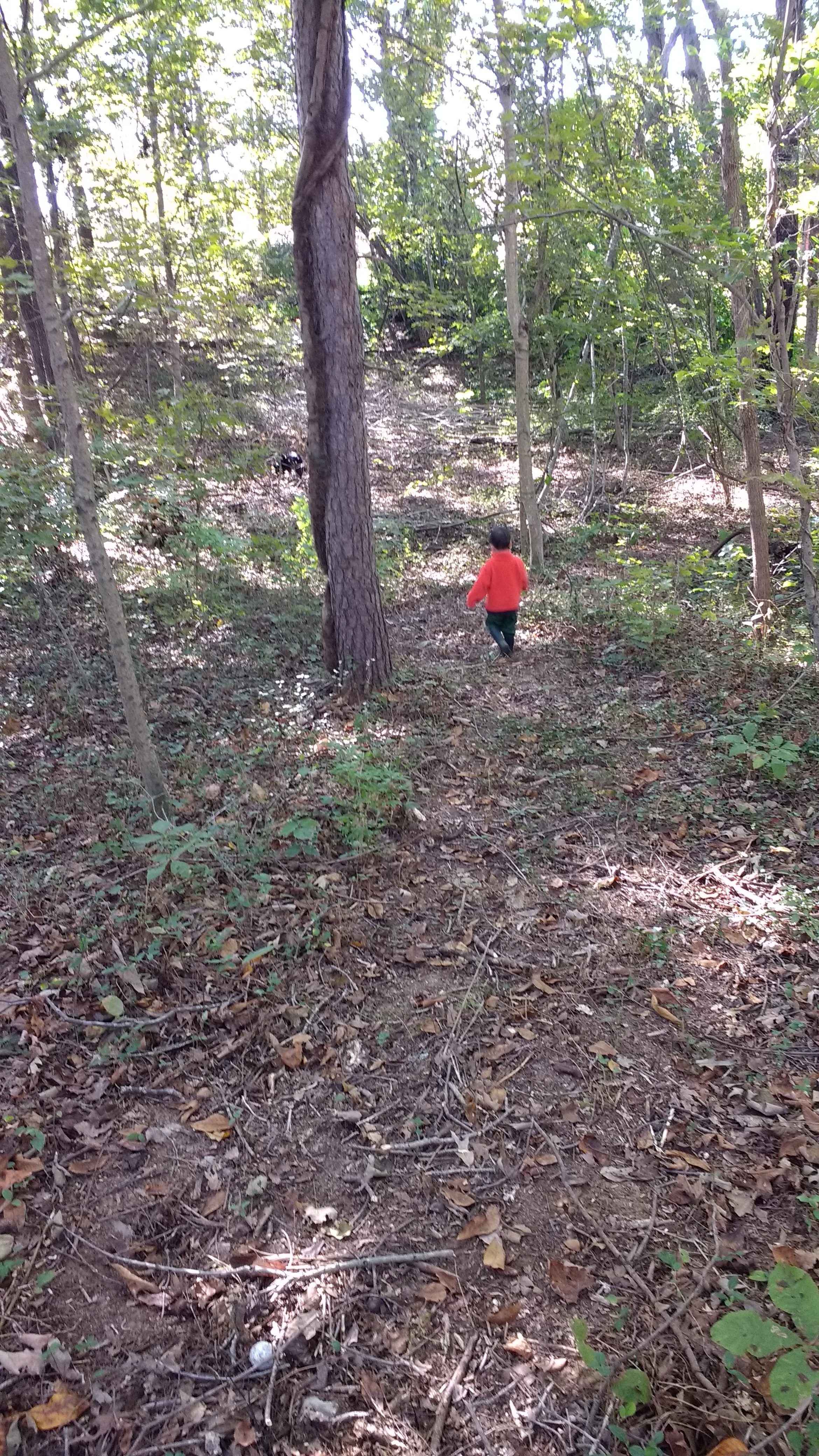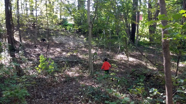 Pancakes and bacon for breakfast with a hot cup of maple syrup sweetened dark roast coffee- that is enough to make my morning. After breakfast though, I got the kiddos dressed and ready to hike through the woods. My husband mowed down some brush to make a trail for us Saturday, so until we got back to the really thick stuff, it was fairly easy going.