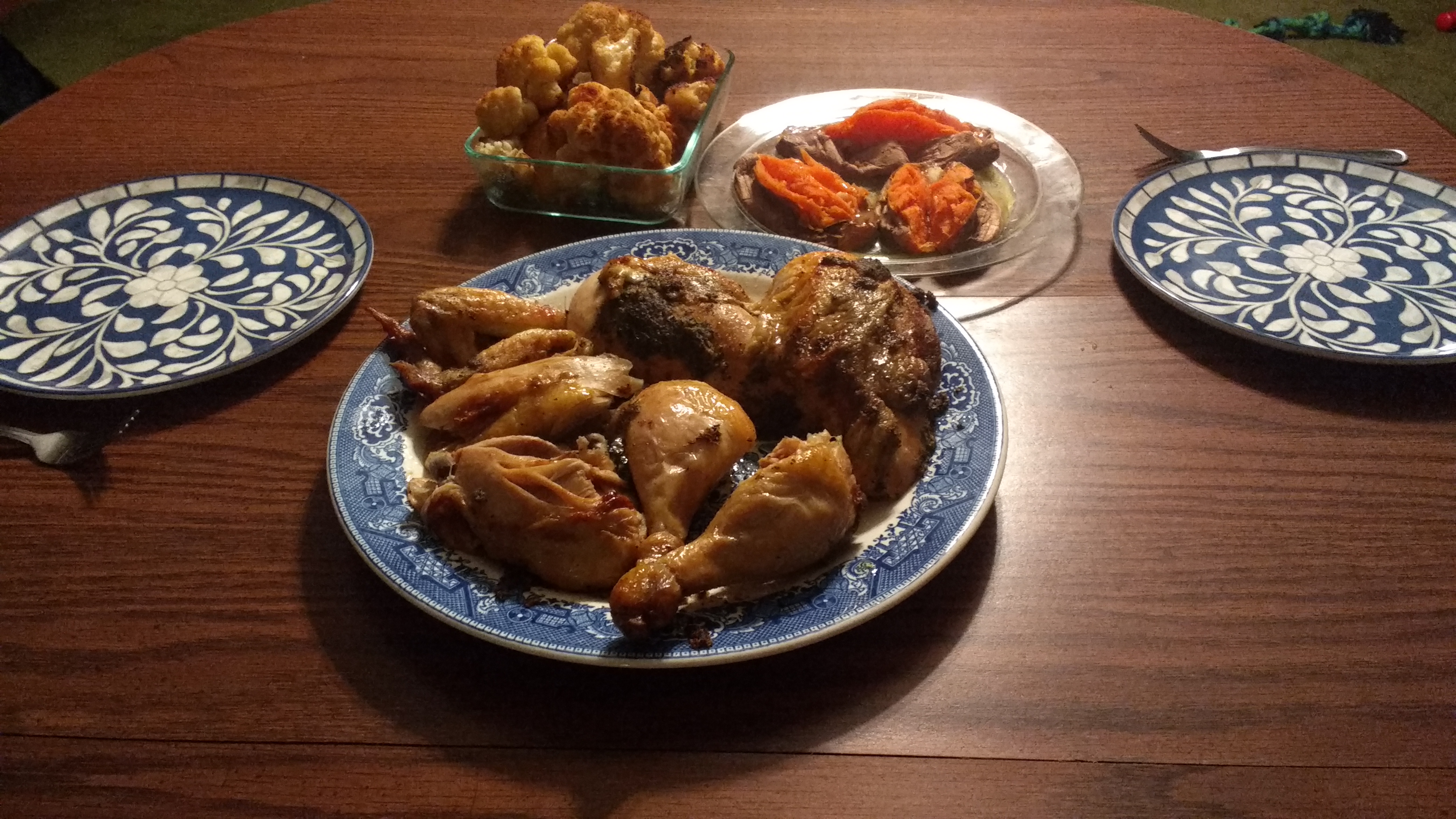 Dinner was rustic and delicious- roast chicken and broiled cauliflower with baked sweet potatoes.