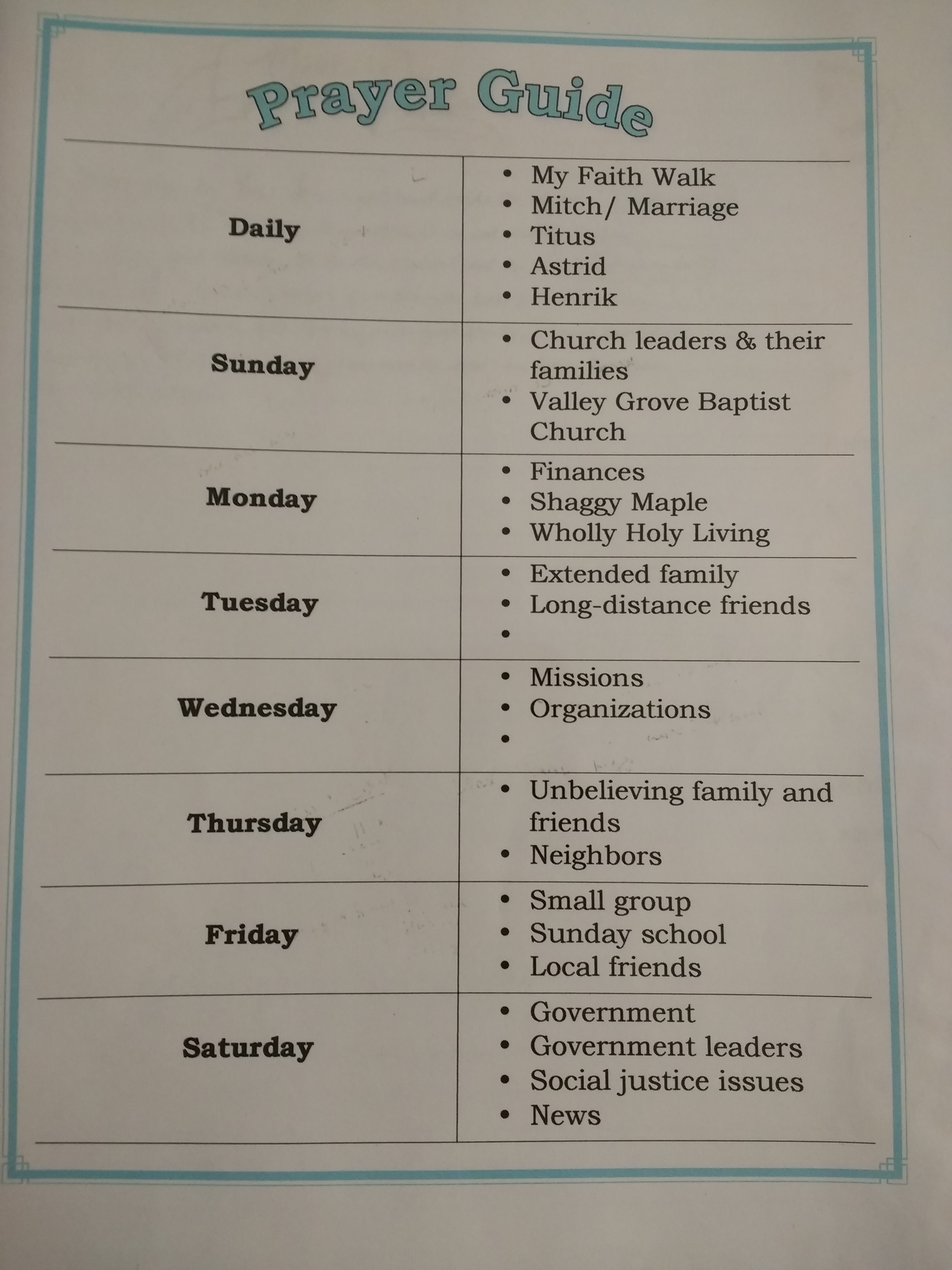 I found myself being overwhelmed by all the things and people I wanted to pray for and when that happens, I tend to shut down entirely. To help with that, I’ve broken down all the things that weigh on my heart into a weekly prayer guide. Here’s the “schedule” I created: