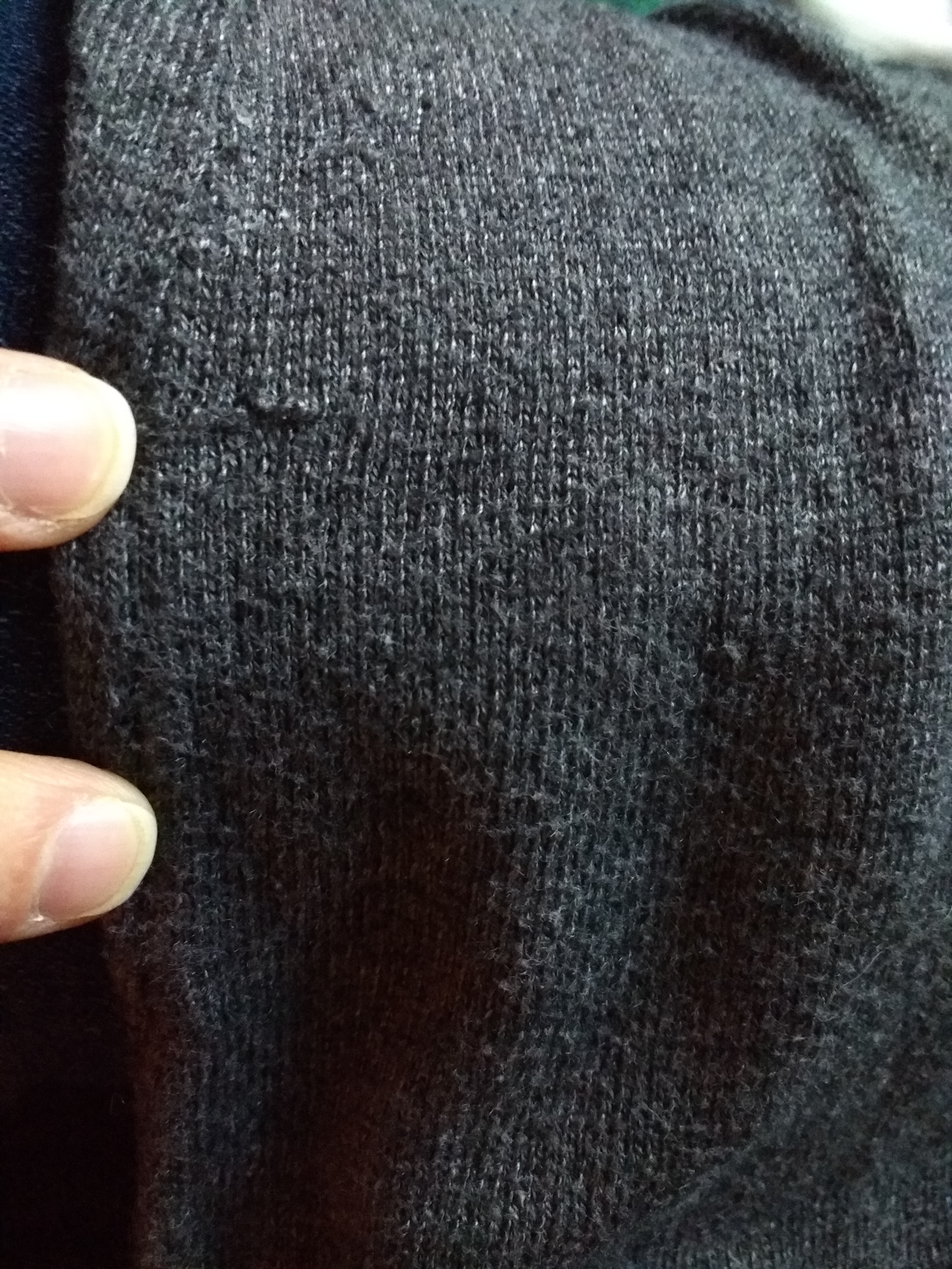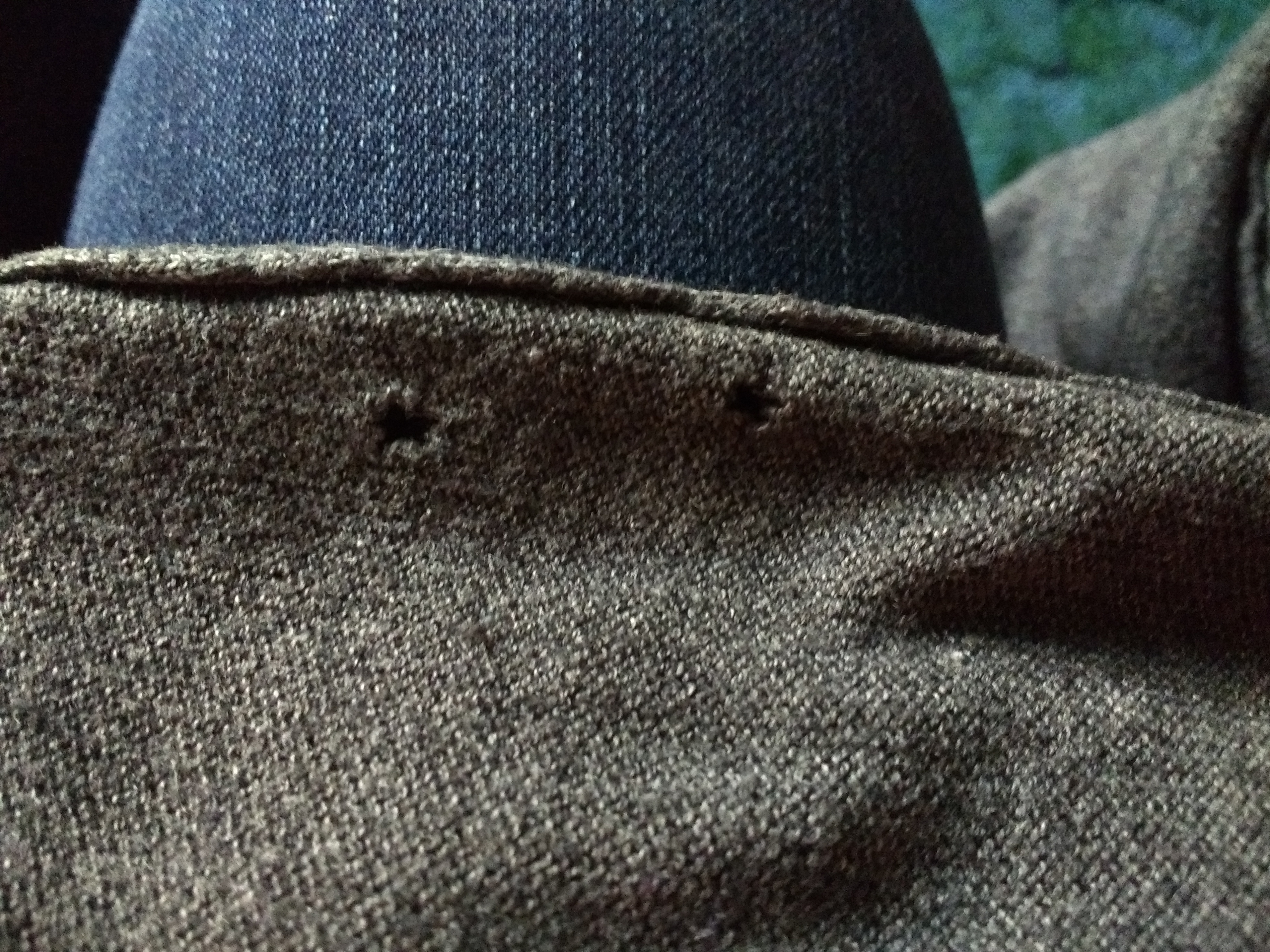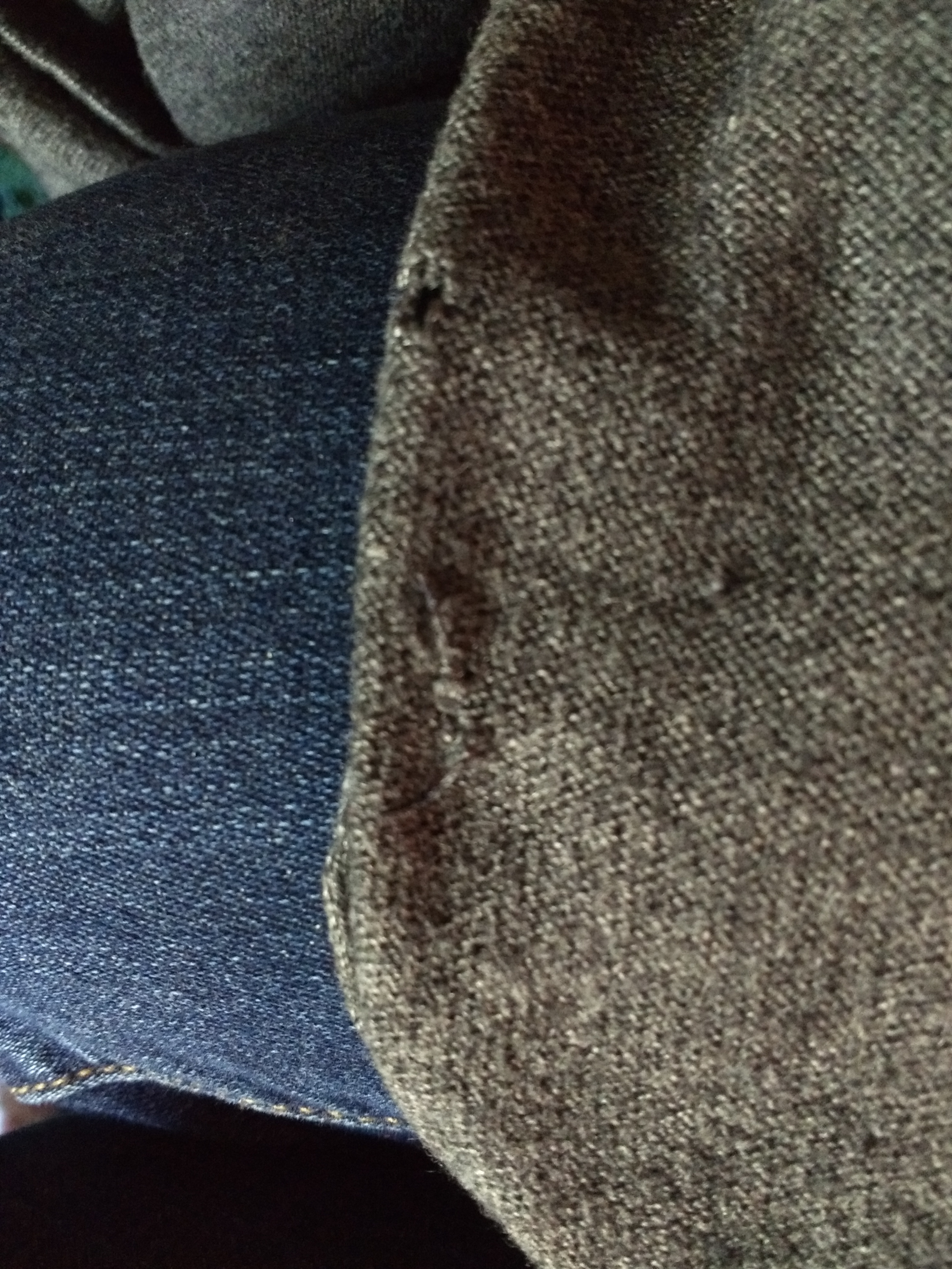 I put that in to practice today when I put on one of my favorite maternity sweaters (yes, I’ve been pregnant for so many consecutive years, I’ve got favorite maternity clothes) and found it had two small holes in the left sleeve, right on the tricep.