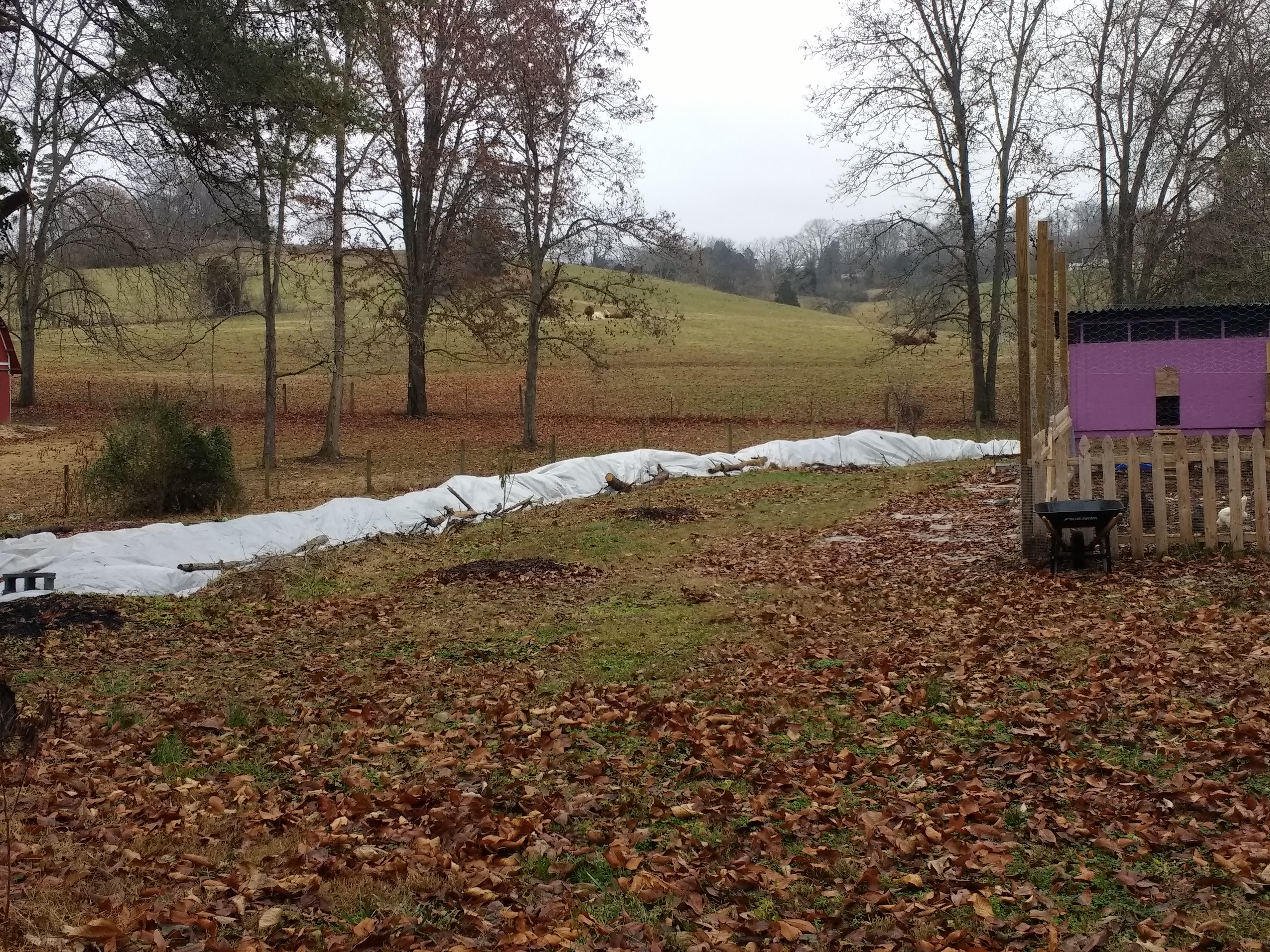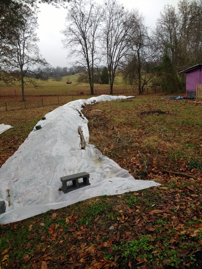 We covered the “hill” of the swale in thick plastic (I would have preferred black, but my husband got this mostly opaque plastic sheeting for free) to kill off the grass and weeds. Once that’s done, we’ll likely cover it in either wood chips or straw to keep unwanted growth down until we plant something in it. I’m thinking either Egyptian walking onions or squash/melons.
