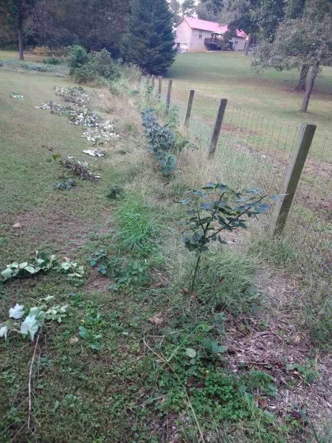 I spaced them about a foot and a half apart. Assuming they all survive, this gives us a solid “hedge.” Assuming they don’t all survive, we’ll have plenty of space to try again.