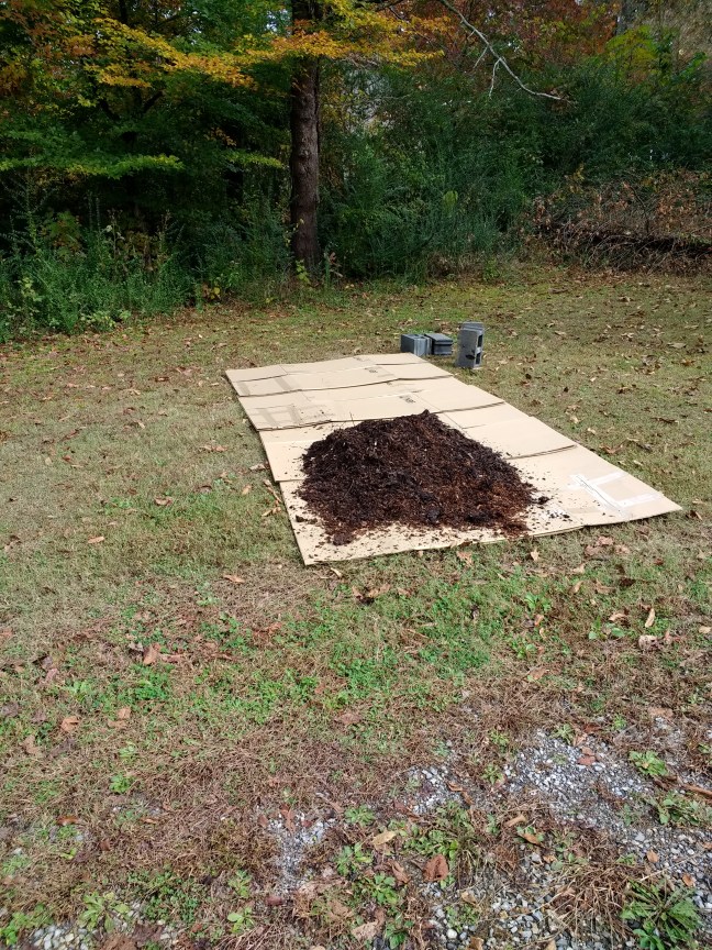 My husband secured a massive amount of some heavy duty cardboard boxes from work so we layed down about 4 of them to keep grass down and eliminate the need for mowing directly around the hive boxes.