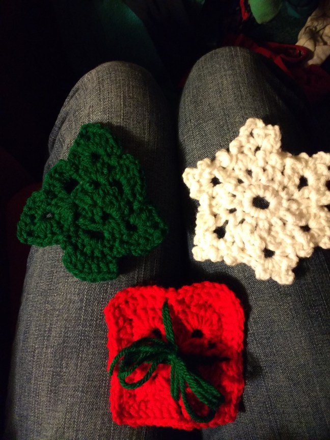 I’ve been crocheting Christmas ornaments. Mostly, I intend to give them as gifts, but if time allows, they may show up on the Etsy shop after Thanksgiving. There’s a Christmas tree, a snowflake, and a present/gift.