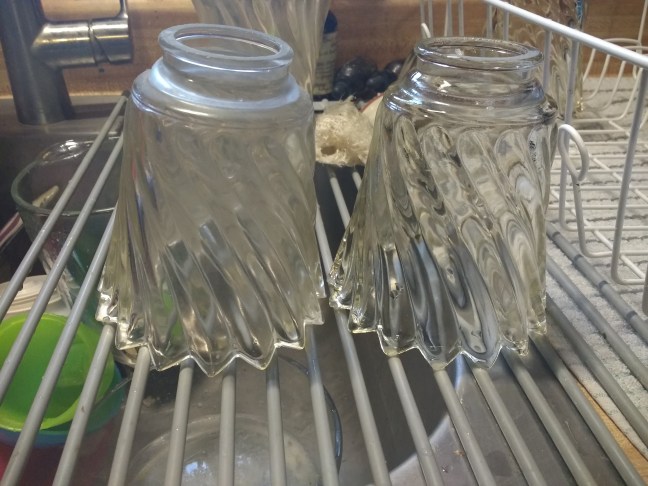 Today, I happened to look up at our light in the dining room and noticed the abysmal state of the ceiling fan and glass light covers. Eew. They were super grimy. So, I decided they needed cleaning.