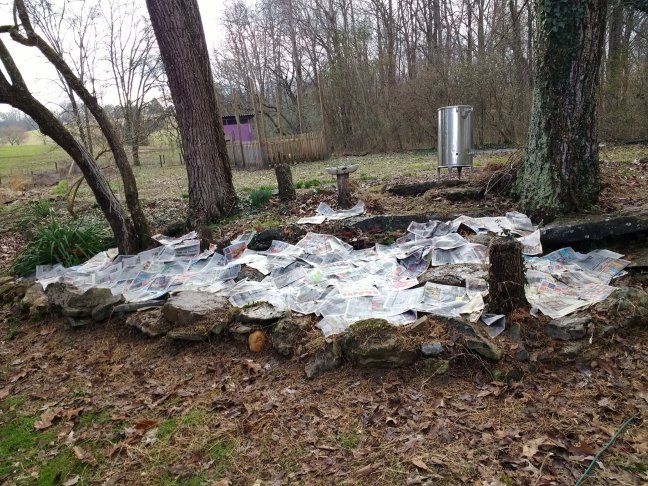 Then I layed a THICK layer of newspaper down, about 5-6 sheets thick. My oldest sprayed it down so it’d stay put- honestly, he just wanted to play with the hose, and it so happened it worked in my favor for him to do so, so win-win.