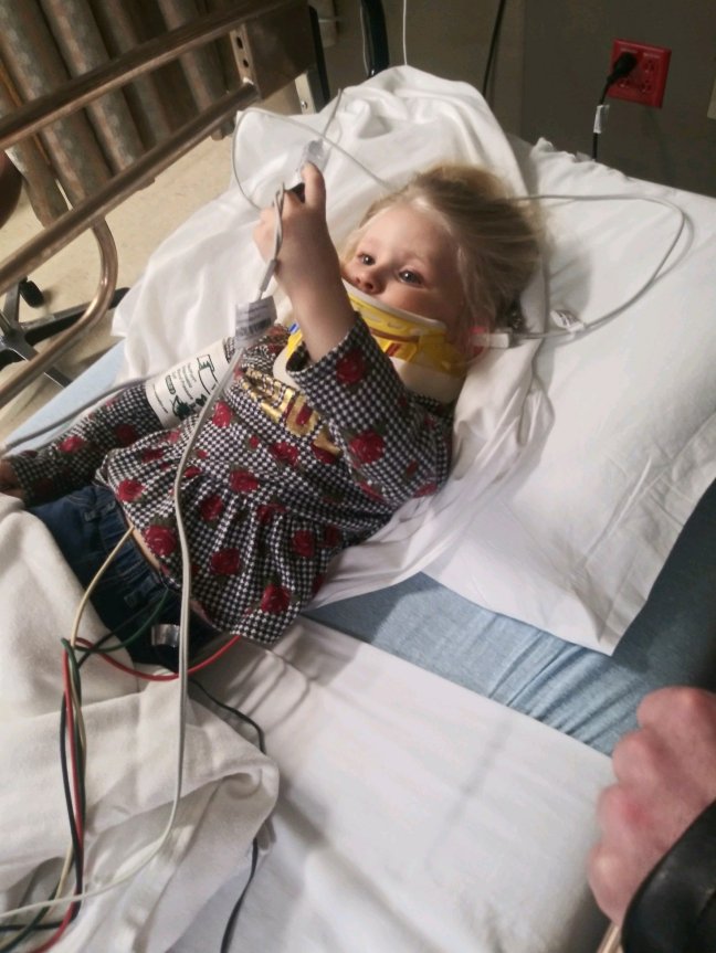 She was then flown by helicopter to Riley’s children’s hospital in Indianapolis, where she received more comprehensive evaluation and treatment. An MRI revealed that the C2 vertebra was completely snapped in half and required surgery to repair.