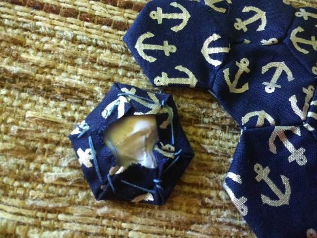 It really is simple. Time consuming, but simple. I used a hexagonal pattern which I found online and printed. Once I had them cut out, I set about folding all the fabric around them to make “hexies” as I’ve seen them called.