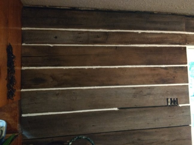 We got the barn wood plank wall up, and I started filling the seams with joint compound.