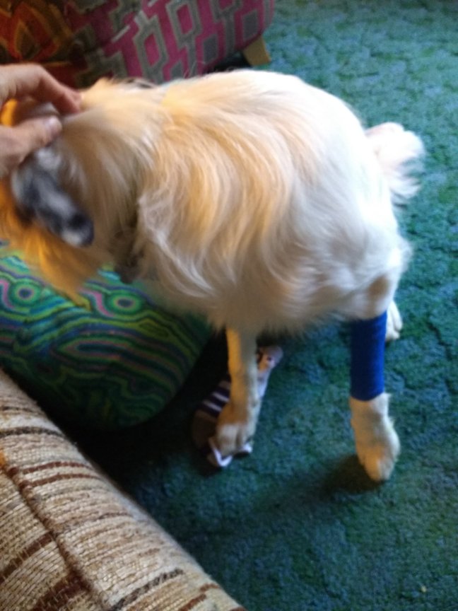 I had to do a patch job on one of our pooches last night. Flynn dog came to the back door with some banged up front paws and lots and lots of burrs and stickers. So the poor little pup got lots of care and lovin’s. You would’ve thought he was Old Yeller the way the kids were concerned and clinging to him. It was precious. They love their pup.