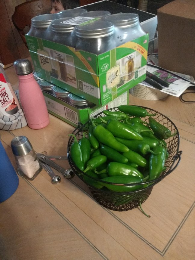 When we got back, I started processing jalapenos. In all, we got about 7 or 8 pints of canned jalapenos, which I’ll add to soups, chili, roasts etc. And I had enough peppers left to do a batch of jalapeno jelly. I love pepper jelly. I couldn’t tell ya why, I just do. So I made 6 half pint jars of that, and they are just waiting their turn to get into the canner.
