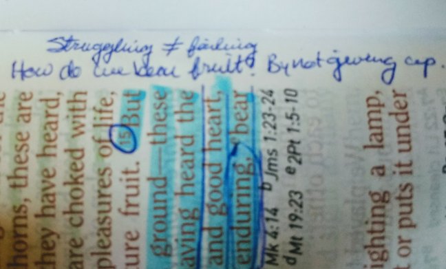 The words that broke through the negative thought patterns were “hold on to it (the Word),” and “by enduring, bear fruit.”