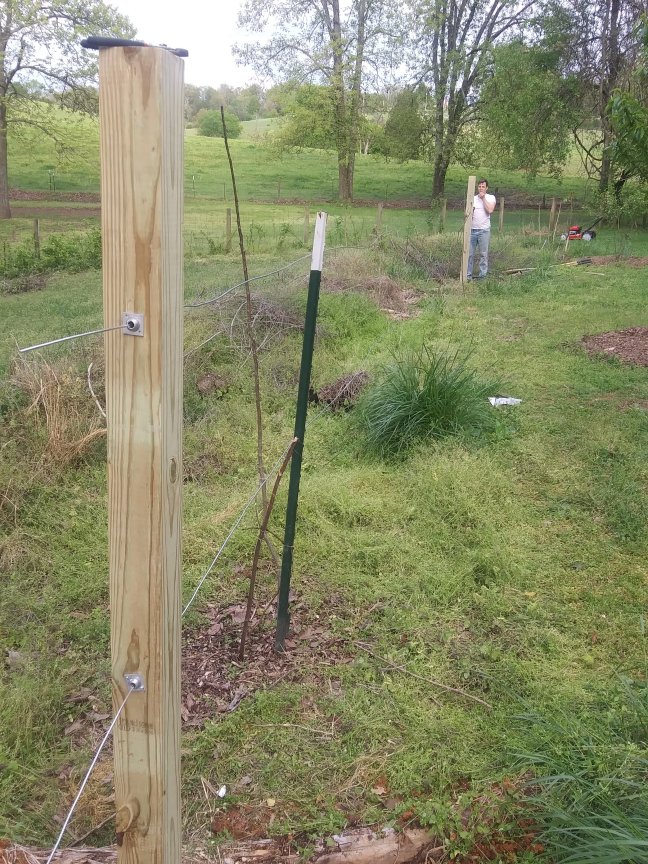That’s been a long time coming. We actually set up temporary T posts until the vines got tall enough to climb to the guide wires. Or- maybe we were just selectively lazy and procrastinated that project? Either is possible. And one is more probable. In any case, we finally got the end posts set, and guide wires up. We followed the example in this video, and set a wire at 3 feet and at 5 feet. The posts are a little wonky 1) because the soil is so soft and moveable and we didn’t concrete them in, and 2) because there is a little tension on the wire. But they can be anchored or otherwise supported when it becomes necessary. For now, the vines aren’t really even reaching the bottom most guidewire yet, let alone putting weight on them, so it’ll do for now.