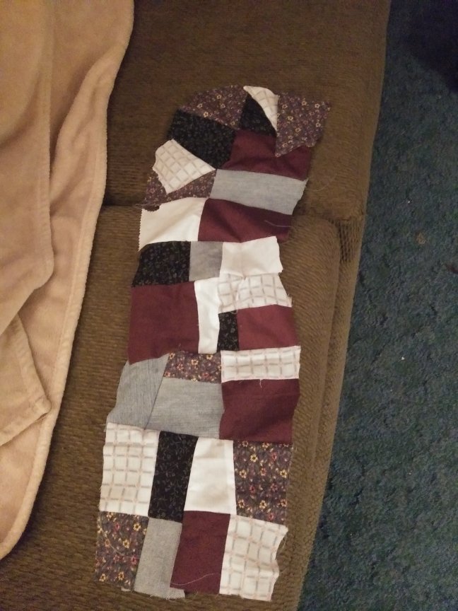 She is very creative and has an eye for choosing a really awesome color palette. This is what we finished at our last one on one night. We’ve got 4 or 5 more panels like it to finish. I love it so far! And she’s requested that I make a matching miniature quilt for her Lamby out of the scrap snips…