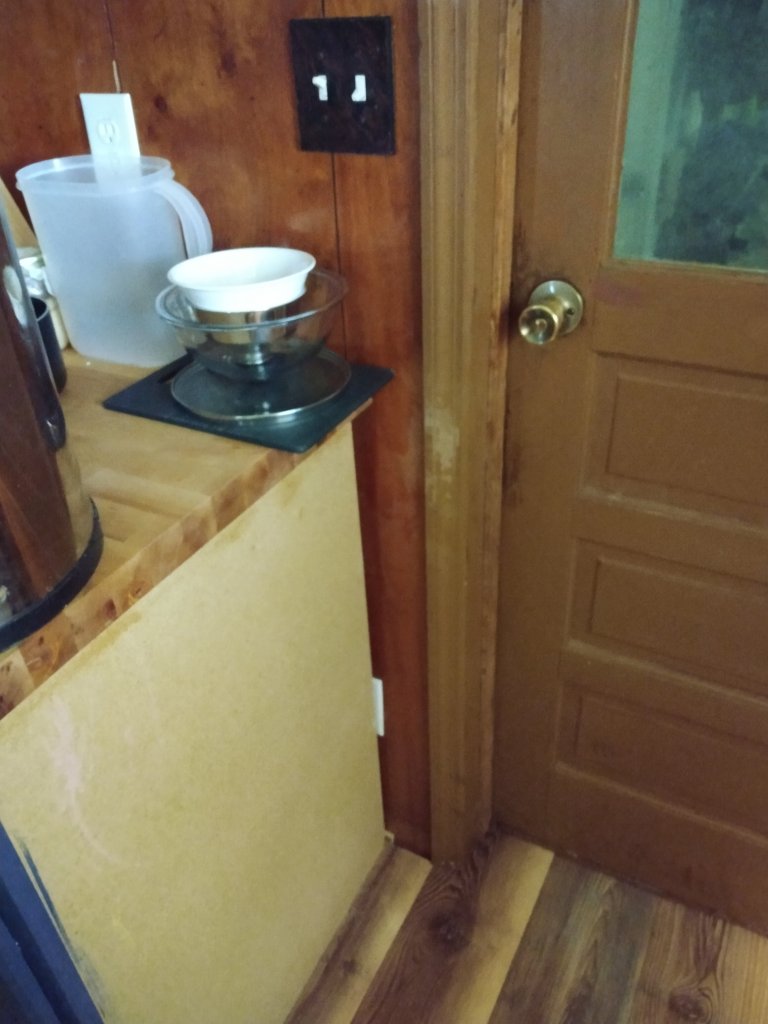 We trimmed up the butcher block and removed about 6″ of it because it was too close to the door frame at 4′ so we swapped the 18″ set of drawers for the 12″ cabinet, and we’re back in business.