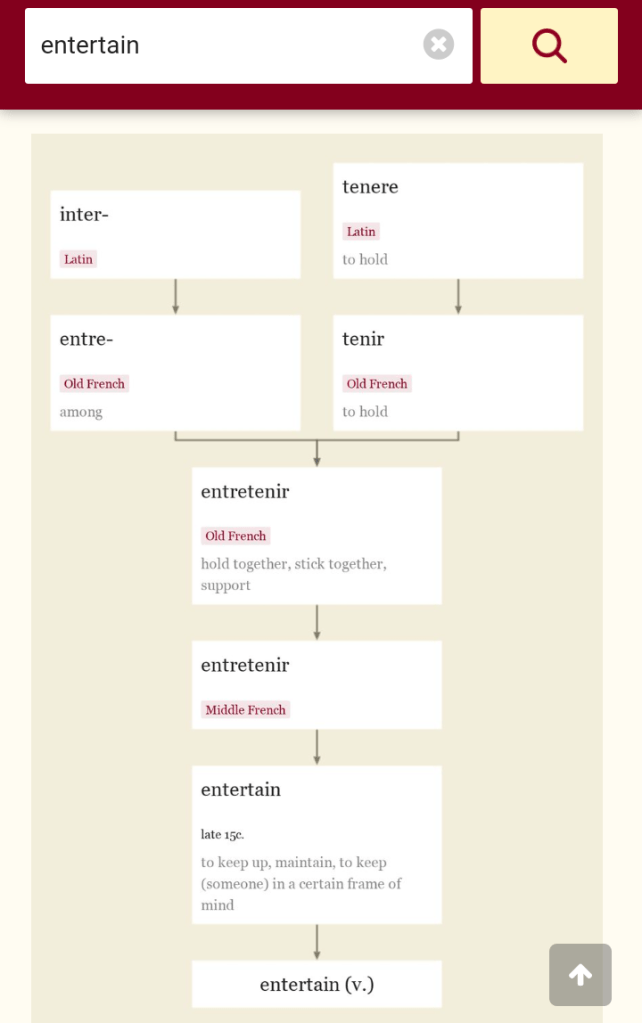 “Enter,” to go into; “tain,” to hold, occupy; “ment,” mind. The goal of, nay, the very definition of entertainment therefore is to enter the mind, hold it captive, and to impart a certain frame of mind or message.