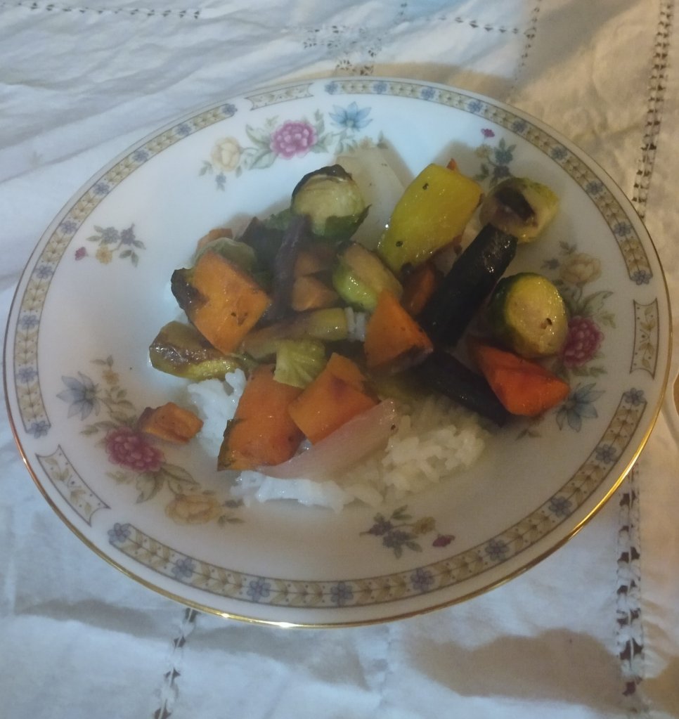 Friday night, I decided on roasted autumn veggies on a bed of jasmine rice.