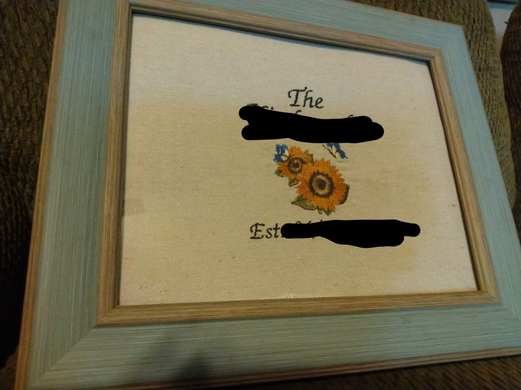 I’ve also enjoyed playing with the embroidery capabilities of the baby lock. It’s a lot of fun, and I’m experimenting with different fabrics, threads, and stabilizers. This is a house-warming gift I did for a couple in our small group. For privacy’s sake, please disregard the blacked out name and dates, and know that the text was a nice classic, scrolling sort of script.