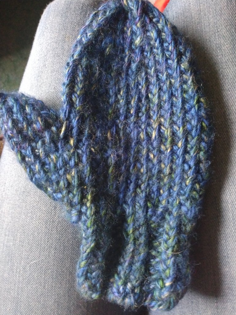 I made my first mitten!!! It needs a friend. But I’ve got a delimma; I had gotten confused on the increases for the thumb gusset stitches. So what I ended up with was a kind of wide, tapering to a pointy thumb kind of wonky mitten. Still cute, still fits my son, but I realized it only after completing it. So, now, my dilemma is, do I make the same “mistakes” on purpose with the 2nd mitten so that the mittens match? Or do I correct them with the 2nd mitten and have one wonky mitten, and one flawless mitten? I’m opting for them to match at this point. So, it makes me cringe a little inside to know I’m intentionally not following the pattern this time, but also, it would bother me more to have 2 non-matching mittens.