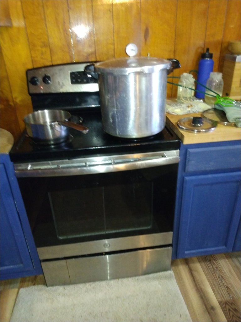 After breakfast, we took care of the outside animals, and then set to work in the kitchen. My oldest peeled pears, my 2nd oldest snapped green beans and cold-packed jars, and the younger two watched enthusiastically.