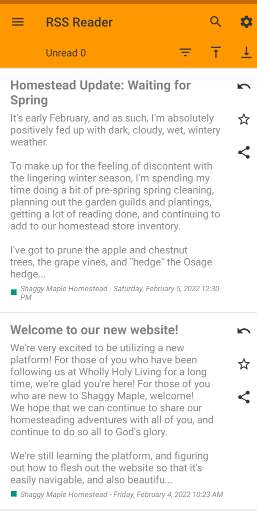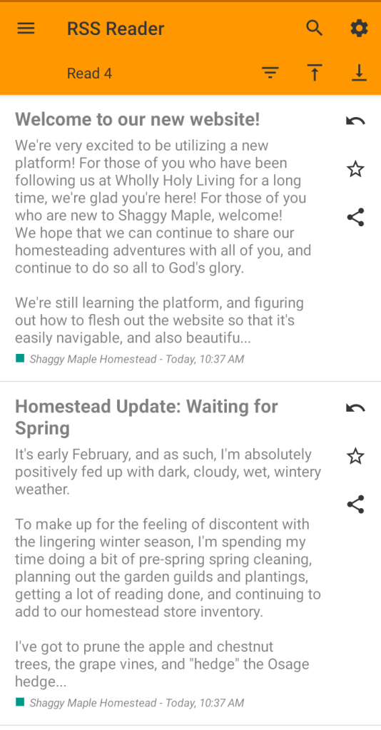 So what does all this mean for Shaggy Maple Homestead? It means that in order to follow our new blog without seeing an XML document when you click the RSS feed button, you’ll have to download an RSS reader app. My favorite so far is this RSS Reader for offline reading.