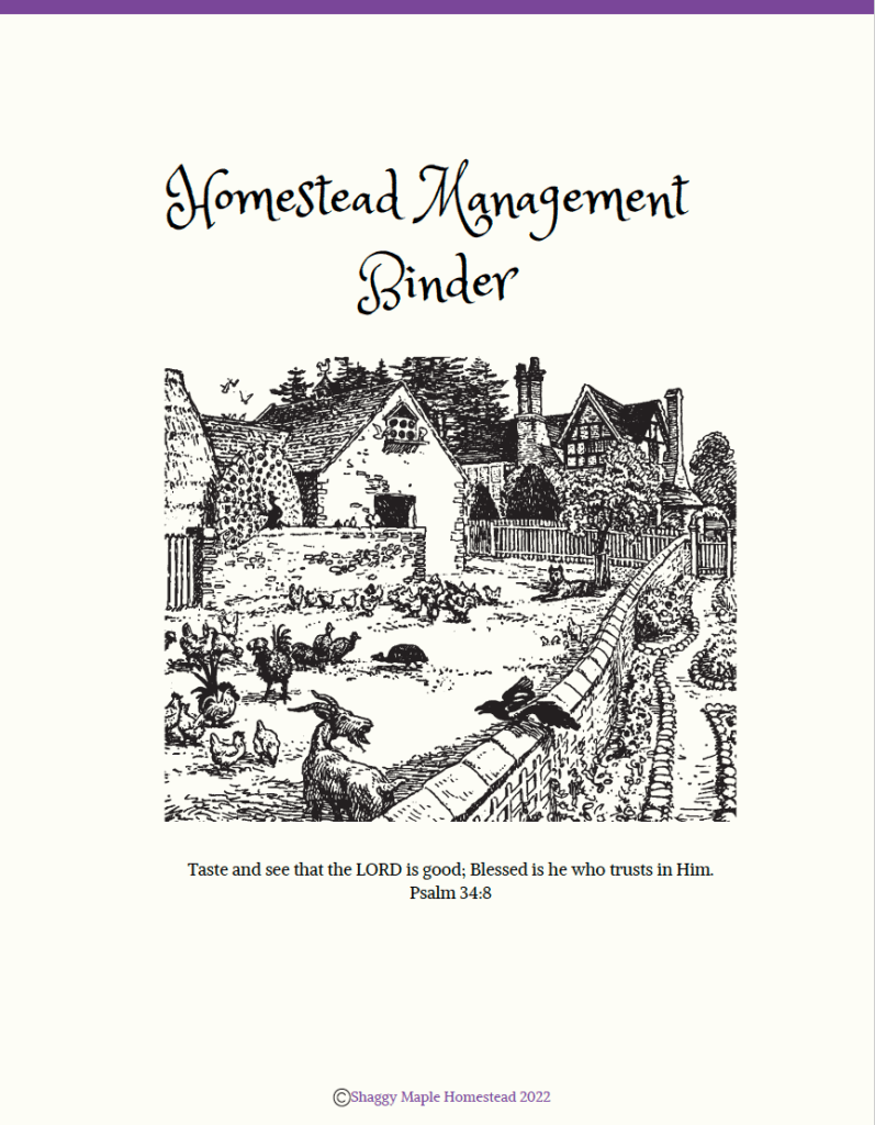 The full Homestead Management Binder includes daily, weekly, and monthly calendars, a homestead project planner, room for sketches and notes as well as record pages for chickens, goats, rabbits, as well as cows, sheep, pigs, quail, and a general “animals” section. Additionally, it has worksheets for managing homestead income and expenses.
