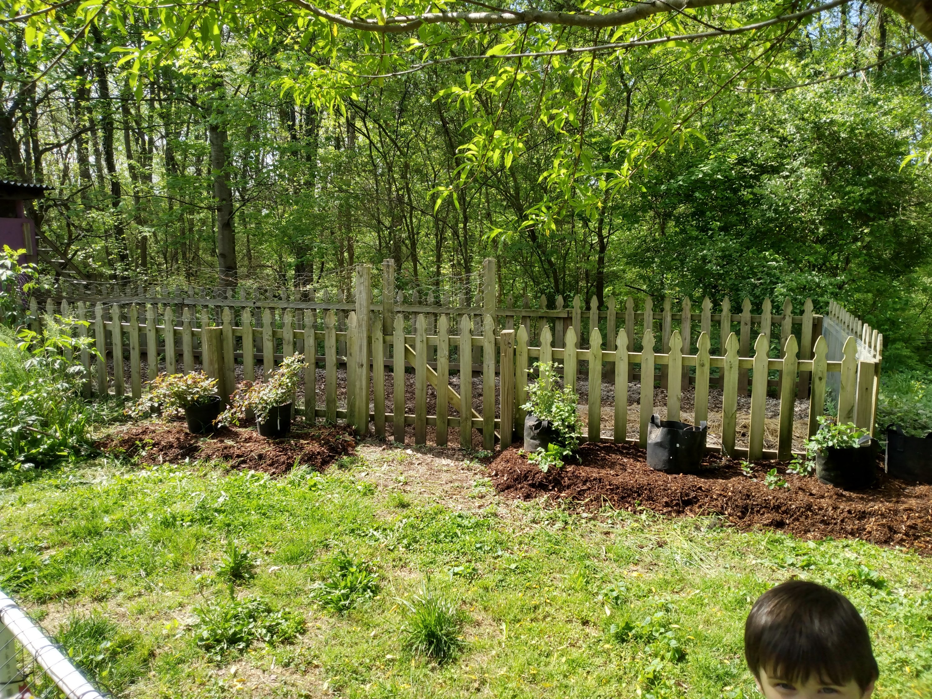 We added woodchips around the border of the garden fence and moved the berry bushes we started last year to their new forever home. We will plant them in a couple more weeks at the optimal time for root growth, so as to alleviate some of the shock to the plants.