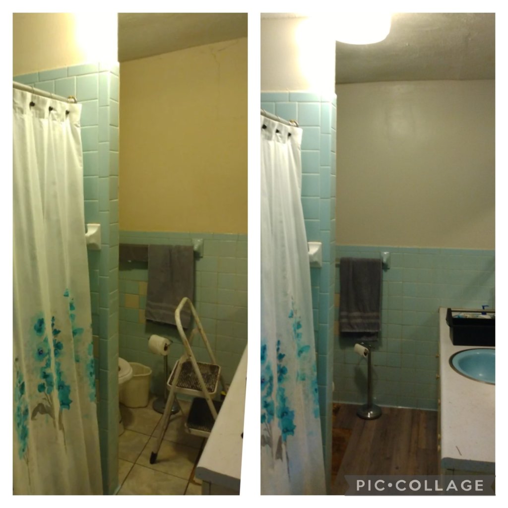 I repaired the cracks in the walls, and gave it a fresh coat of Behr premium plus, semi-gloss paint (which I was gifted) in Oyster. So in all, my whole bathroom Update has cost me $4, and sweat equity.